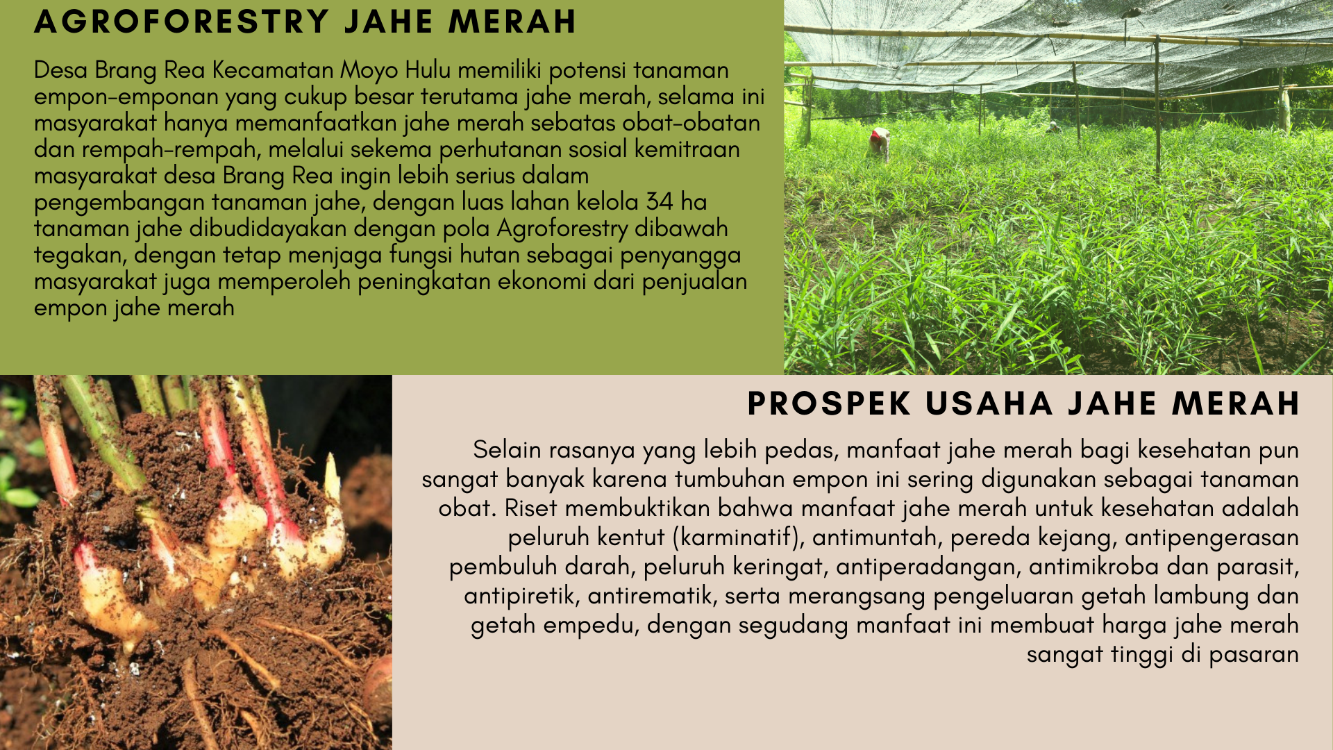 Desa Brang Rea Kecamatan Moyo Hulu memiliki potensi tanaman empon-emponan yang cukup besar terutama jahe merah, selama ini masyarakat hanya memanfaatkan jahe merah sebatas obat-obatan dan rempah-rempah, melalui sekema perhutanan sosial kemitraan masyarakat desa Brang Rea ingin lebih serius dalam pengembangan tanaman jahe, dengan luas lahan kelola 34 ha tanaman jahe dibudidayakan dengan pola Agroforestry dibawah tegakan, dengan tetap menjaga fungsi hutan sebagai penyangga masyarakat juga memperoleh peningkatan ekonomi dari penjualan empon jahe merah